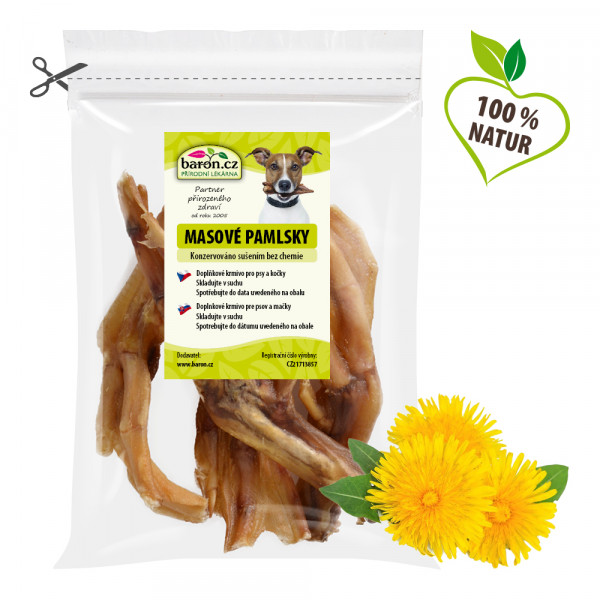 Sušený pamlsek pro psy z kachních běháků, vhodný jako odměna nebo zpestření jídelníčku. Sušené kachní běháky jsou křupavým a houževnatým pamlskem pro psy. Běháky jsou zbavené drápků, aby nedošlo k poranění. Šetrné sušení teplým vzduchem zachovává důležité živiny a minerály. Pamlsek můžeme podávat mezi jídly pro doplnění energie, nebo jako svačinku při delší vycházce. Délka běháku je 10 až 11 cm. Intenzivní chuť a vůně, bez přidaných konzervantů. Šetrné sušení teplým vzduchem pro zachování živin. Zdravá houževnatá odměna nebo zpestření jídelníčku. Baleno v sáčku se zavírací lištou, praktické na cestování. Kompetentní výrobce, který rozumí přirozenému zdraví.